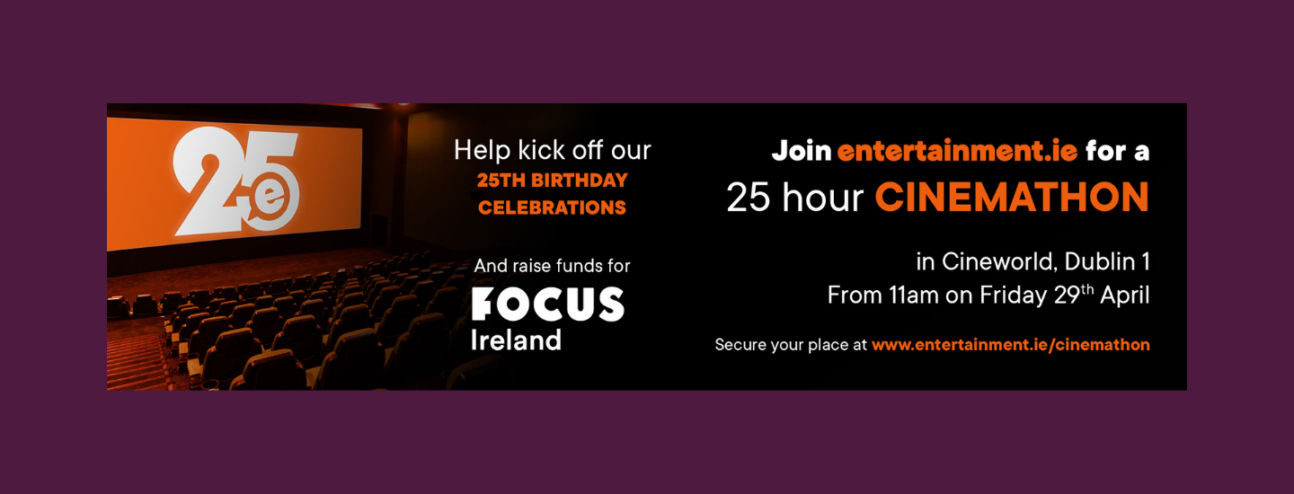 In order to secure your seat, you need to register with entertainment.ie, and commit to fundraising for Focus Ireland. Your friends and family can sponsor you for taking on the challenge of 25 hours of film in one sitting on April 29.